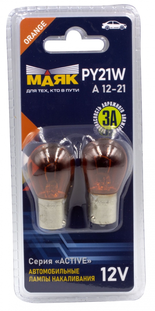 Лампа "Маяк" PY21W 12V 21W, A 12-21 BAU15s ORANGE ACTIVE (2 шт), в блистере