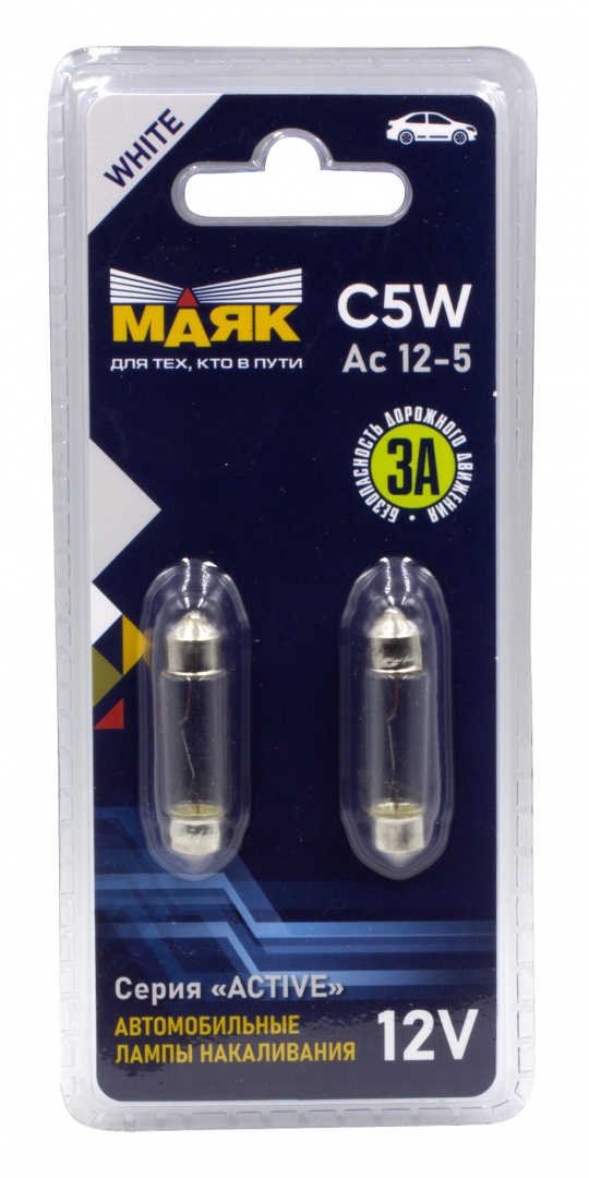 Лампа "Маяк" C5W 12V 5W, Ac 12- 5 SV8.5/8 (39мм) ACTIVE (2 шт), в блистере