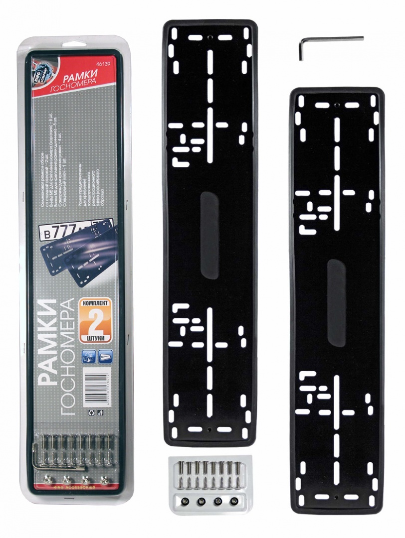 Рамка номерного знака "King" металлическая с силиконовой прокладкой (с набором для крепления, 21 предм.), черная, 2 шт.