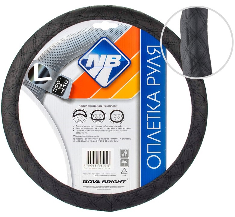 Оплетка рулевого колеса "Nova Bright" (L) экокожа, черная с черной прострочкой ромбиками