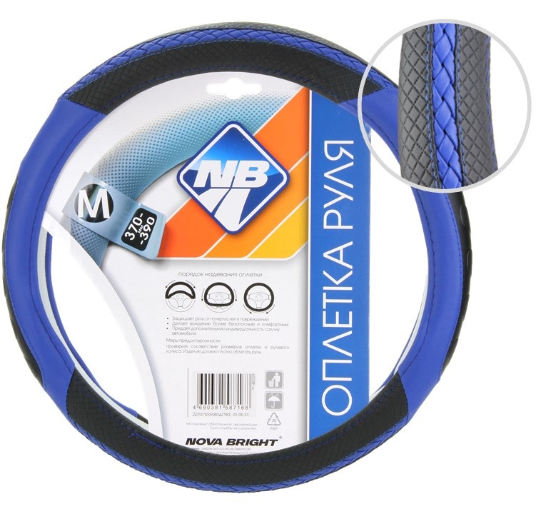 Оплетка рулевого колеса "Nova Bright" (M) экокожа, синяя с плетеной вставкой и синей прострочкой